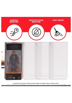 Evoretro presenta este pack de 10 fundas diseñadas para encajar las figuras de la línea Star Wars The Black Series de Hasbro con su packaging original con forma trapezoidal. Tienen unas dimensiones interiores de 23 x 12,5 x 5 cm y están fabricadas con plástico PET libre de ácido de 0,35 mm de grosor. Permiten mantener las figuras libres de arañazos, suciedad y polvo. ATENCIÓN: No se incluyen las figuras que se ven en las imágenes, utilizadas para fines de presentación.
