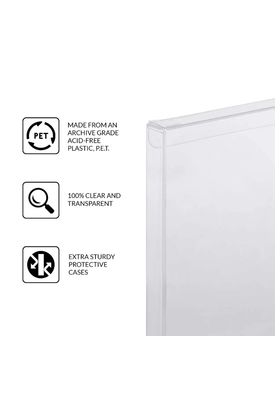 Evoretro presenta este pack de 25 fundas diseñadas para encajar tanto los videojuegos para Microsoft Xbox One como para Sony PlayStation 3 y 4 con su packaging original. Tienen unas dimensiones interiores de 17 x 13,7 x 1,5 cm y están fabricadas con plástico PET libre de ácido de 0,30 mm de grosor. Permiten mantener tus videojuegos libres de arañazos, suciedad y polvo. ATENCIÓN: No se incluyen los videojuegos que se ven en las imágenes, utilizados para fines de presentación.