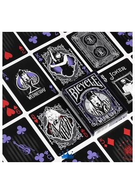 Cartamundi presenta, dentro de la colección Bicycle, esta baraja de poker de Wednesday. Inspiradas en la serie de "Wednesday", las cartas son de tinta negra con los personajes favoritos de la serie. Estuche decorado con arañas, pirañas, cuervos..., y un acabado Air Cushion para un mejor manejo, barajado y durabilidad de las cartas.