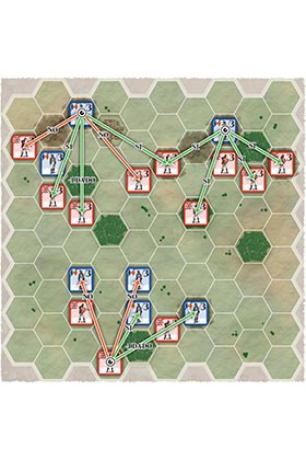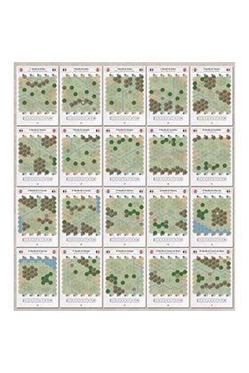 Cada escenario cuenta con un mapa con rejilla hexagonal y unas instrucciones de despliegue de las unidades del jugador y de la IA y su comportamiento.