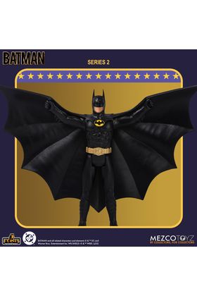 Mezco Toyz suma a su colección 5 Points la versión con capa de planeo de la figura articulada de Batman basada en su apariencia en la película homónima de 1989. Mide aproximadamente 9,5 cm y se presenta en formato blíster con estética retro. Incluye 1x cabeza con cicatrices, 2x brazos intercambiables para sostener la capa, 2x capas (desplegada para planear y estándar) y 1x batarang. Ideal para exhibir con el resto de figuras de la serie 2 (se venden por separado).