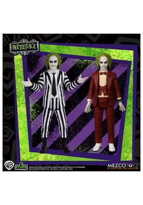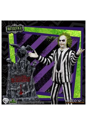 De la película de 1988 "Beetlejuice" (o "Bitelchús" en España) de Tim Burton llega a la colección 5 Points de Mezco esta figura del protagonista con su característico traje a rayas blancas y negras. Mide 9,5 cm e incluye su propia lápida. Se presenta en un blíster.