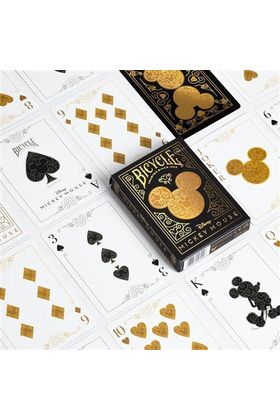 Cartamundi presenta, dentro de la colección Bicycle, esta baraja de poker de Black & Gold Mickey. Estuche con foil dorado, elaborado diseño y estampado. Figuras personalizadas con Mickey y Minnie Mouse. Reverso personalizado con foil Metalluxe dorado. Acabado Classic Air Cushion.