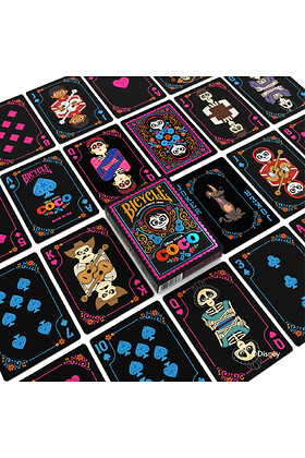 Cartamundi presenta, dentro de la colección Bicycle, esta baraja de poker de Coco. Las figuras están diseñadas de forma personalizada con los personajes de la película de Pixar. Acabado Air Cushion.