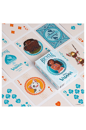 Lleva tu próxima noche de juegos a una aventura en Te Fiti con las cartas Bicycle inspiradas en Vaiana de Disney! Dentro del estuche brillante, gracias al foil azul, encontrarás a Vaiana, Maui, junto con los «aperitivos del barco» HeiHei, el pollo, y Pua, el cerdo. CARACTERÍSTICAS: Estuche estampado en foil con sorpresas impresas en el interior, reverso diseñado a medida con la canoa de Vaiana sobre el azul del océano, acabado Air Cushion de Bicycle para un mejor manejo, barajado y durabilidad de las cartas, fabricado en EE.UU.