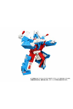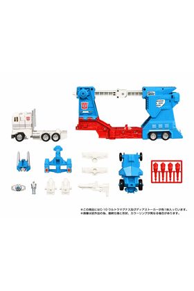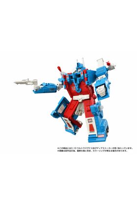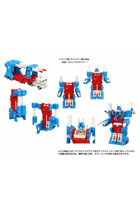 Takara Tomy lanza dentro de la colección Missing Link la figura C-10 de Ultra Magnus, una reinterpretación fiel del clásico personaje del universo "Transformers". Esta figura mide 26 cm en modo robot y se convierte en camión, con un remolque que puede acoplarse y convertirse en una base de operaciones móvil permitiendo transportar otras figuras de la línea Missing Link (se venden por separado). Las articulaciones móviles permiten una gran flexibilidad a la hora de colocarlo, incluso cuando está combinado. Además, el protector del pecho de Ultra Magnus ha sido restaurado a su forma original. Incluye: 1x cabeza alternativa, 1x figura humana que puede usarse con Deerstalker y Protector Machine, 1x bláster, 2x lanzamisiles, 2x conectores (A y B) y otros accesorios. El robot tiene impreso un emblema "secreto" que muestra el símbolo de Decepticon Corps al calentarlo con el dedo. Se presenta con embalaje original con un diseño actualizado, tarjeta de personaje e instrucciones en japonés. UNIDADES LIMITADAS.