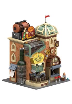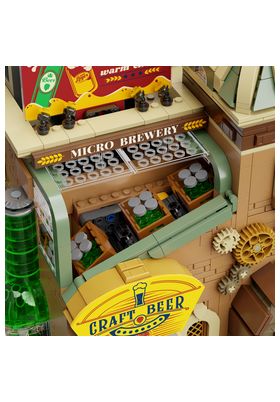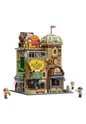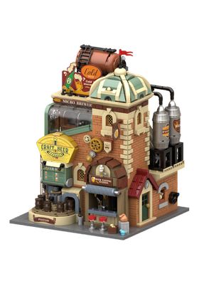 Pantasy presenta, dentro de la colección Retro Series, este set de construcción de Craft Brewary. Tiene unas medidas de 35 x 26 x 26 cm y está inspirado en una auténtica cervecería artesanal. El set está formado por 3266 piezas y requiere de 6 horas aproximadamente para su montaje. Cuenta con sus característicos tanques de almacenamiento de agua, un cartel vintage, un bar de degustación con vistas a la calle, una línea de embotellado y una cinta transportadora para la cerveza. Dos paredes situadas en la parte trasera se pueden abrir y revelar los 3 niveles con los que cuenta el set. En el nivel inferior se encuentra la fábrica de cerveza. En la primera planta tenemos la oficina y la superior encontramos la sala de estar. Gira el mando situado en la base del lado derecho del edificio para activar cuatro funciones dinámicas: transportador giratorio de botellas de cerveza, engranajes de pared móviles, transferencia de la plataforma de entrega de barriles y acción de embotellado simulada. Incluye un manual de instrucciones y 3 minifiguras (un trabajador, el propietario y un cliente). Edad mínima recomendada 6 años.