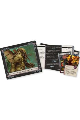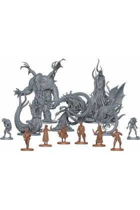 45 miniaturas de plástico de gran detalle, 1 libro de reglas, 17 piezas de tablero de doble cara, 1 tablero de la historia, 10 tableros de Investigador, 64 cartas de Mitos, 90 cartas de Descubrimiento, 12 cartas de Locura, 8 cartas de Etapa del Primigenio, 2 cartas de secuaces del Primigenio, 6 cartas de Episodio, 6 cartas de monstruos del Episodio, 8 dados personalizados, 5 peanas coloreadas, 30 marcadores de plástico, 147 fichas.