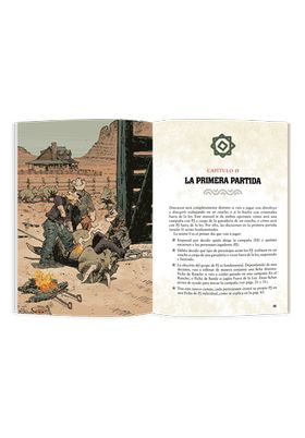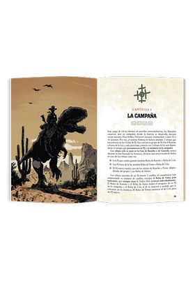Un juego de rol muy pulp en un salvaje Oeste habitado por dinosaurios. Norteamérica se ha convertido en tierra de oportunidades. La fiebre del fósil está atrayendo oleadas de buscavidas desde el Viejo Continente. En las tierras salvajes hay depredadores, pero no son chacales ni lobos, sino velociraptors y allosaurus. La población nativa, a quienes llaman «pieles verdes», culmina sus tótems con las coronas cornudas de triceratops. Los ranchos cuentan sus cabezas de ganado en estegosaurios y la ley se impone a lomos de un T. rex. Podréis elegir entre dos modos de juego: En el Rancho, donde interpretáis a dinogirls y dinoboys al cuidado del ganado de dinosaurios, enfrentándose a un depredador que no da tregua, a un rancho rival o al tráfico de saurios... Y Fuera de la Ley, donde seréis los miembros de una banda forajida que saquea granjas, asalta caravanas o roba ganado evitando llamar la atención. Dinowest emplea el sistema de juego Roleína,con influencias de Fate y los llamados PbtA o FitD. Podréis jugar un one shot, pero Dinowest realmente brilla en modo campaña! El paso del tiempo estará marcado por una serie de relojes que se activarán durante la Fase de Rancho o de Guarida, el resto de la sesión jugaréis La Aventura donde resolveréis conflictos, asumiréis las consecuencias y tendréis que emplear a fondo vuestros Dinopuntos. Para jugar necesitáreis: de 2 a 5 participantes (incluida la DJ), al menos 3d6, tokens para los Dinopuntos, una Ficha de PJ y la de Rancho o Banda para el grupo. Incluye: sistema y ayudas de juego, dos aventuras completas, semillas y consejos para hackear y expandir Dinowest.