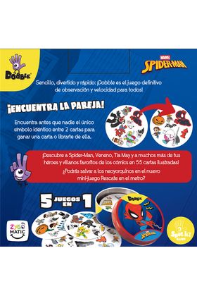 Sencillo, divertido y rápido: Dobble es el juego definitivo de observación y velocidad para todos. Encuentra antes que nadie el único símbolo idéntico entre dos cartas para ganar una carta o librarte de ella. Descubre a Spiderman, Venom, Tía May y muchos más héroes y villanos de los cómics en 55 cartas ilustradas y pon a prueba tus reflejos mientras compites por ser el más rápido. Incluye el mini-juego Rescate en el metro para una experiencia aún más emocionante. Contenido: 55 cartas. Idioma: Español. Número de jugadores: 2 a 8. Edad recomendada: 6 años o más. Tiempo de partida: 15 minutos.