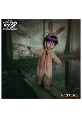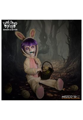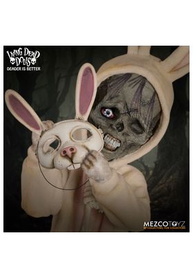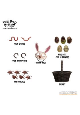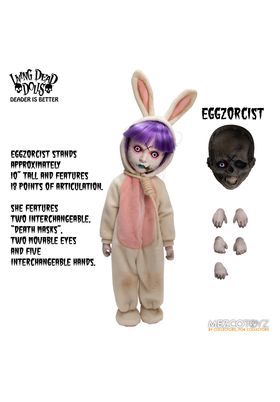Mezco presenta la figura de Eggzorcist de Living Dead Dolls. La figura mide 25 m y cuenta con 18 puntos de articulación permitiendo una amplia gama de posibilidades de poses únicas. Eggzorcist se presenta en una caja con forma de ataúd. Incluye 1x máscara de muerte, intercambiable y expresiva, 2x ojos móviles. 6x manos, un disfraz de conejito envejecido con alambre para posar integrado en las orejas o un lazo de cuerda real, 1x cesta de papel, 1x máscara de conejo, 2x gusanos, 2x ciempiés, 5x huevos en diferentes fases de eclosión (caben en la cesta perfectamente) y 6x cucarachas.