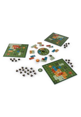 Contenido: 4 tableros de Jardín, 52 fichas de Flor, 12 fichas de Flor pequeña, 1 tablero de Campo, 50 Abejas, 1 ficha de Sol, 1 ficha de Participante inicial, 6 fichas de 5 Abejas, 3 fichas de IA, 1 bloc de puntuación y 1 bolsa.