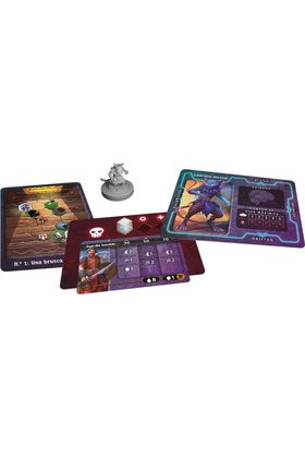 6 mercenarios diferentes, cada uno con una microminiatura, una carta de Personaje, 8 cartas de Capacidad de doble cara y mucho más, 22 cartas de Escenario con minimapas de batalla, 24 fichas de Estado, 10 cartas de Atributos de monstruo a doble cara con 20 enemigos distintos