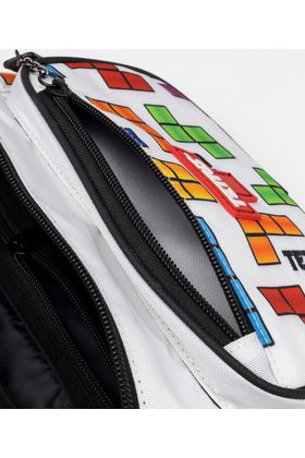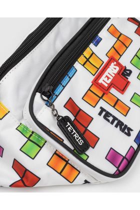 Itemlab presenta dentro de su línea de productos esta riñonera casual clásica basada en el juego de Tetris. Esta riñonera es repelente al agua, está fabricada con poliéster reciclado. Cuenta con una parte trasera acolchada para mayor estabilidad y comodidad. También contiene 2 bolsillos de red en el interior y un bolsillo adicional con cremallera en la parte delantera. La riñonera es blanca con las piezas del juego.