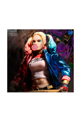 Mezco, dentro de su colección, One:12 Collective presenta una figura basada en la película de "Suicide Squad". Se trata de Harley Quinn, la chica desordenada y extremadamente peligrosa conocida formalmente como la doctora Harleen Quinzel, ahora novia del villano psicótico Joker. Esta figura incluye tres cabezas recientemente desarrolladas y detallados que ofrecen la semejanza de Margot Robbi's, un revolver, un bate de baseball, cinco manos intercambiables y una base de exposición. Incluye también un collar de gargantilla, 4 pulseras con puntas, chaqueta "Propiedad de Joker", camiseta Daddy's Little Monster, pantalones shorts, cinturón y botas.