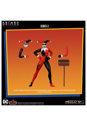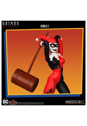 Mezco Toyz presenta, dentro de la colección 5 Points, la figura de Harley Quinn. Mide 9,5 cm y está basada en el personaje de la serie de animación de los 90 "Batman: The Animated Series". Contiene 1x cabeza extra, 2x brazos alternativos y 1x martillo. Puedes exponerla junto a las figuras de Sky Dive Batman, Two-Face, Mr. Freeze y Batman con su Batcycle (se venden por separado).