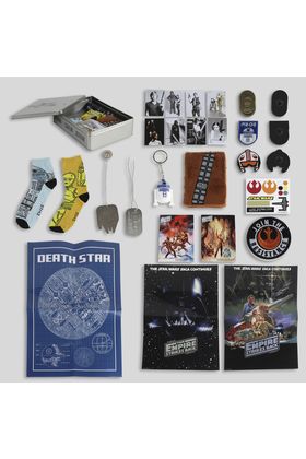 Cerdá presenta este kit para coleccionistas inspirado en la saga "Star Wars". Se presenta en un estuche de metal con relieve de 30 x 16,9 x 8 cm que recrea la cámara de carbonita en la que se criogenizó a Han Solo. Incluye 1x cadena con placa de identificación, 1x marcador de libro magnético, 2x pares de calcetines de R2-D2 y -C3PO, 1x libreta con cubiertas tipo Chewbacca, 1x llavero del Halcón Milenario, 1x hoja de pegatinas, 4x pines e insignias, postales, fotos, 2x posters de "The Empire Strikes Back" (El imperio contraataca" en España) y 1x póster de los planos de la Estrella de la Muerte.