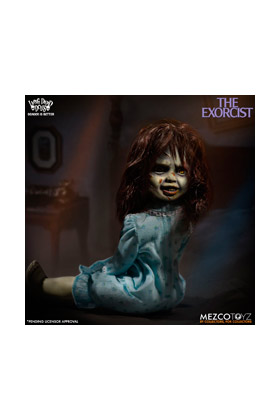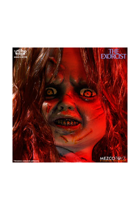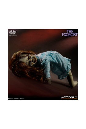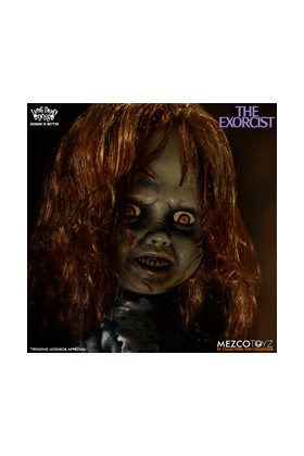 Mezco, dentro de la colección de las muñecas zombie o "Living Dead Dolls" encontramos algunos modelos dedicados a personajes del cine clásico de terror o fantástico, como esta versión de la niña del Exorcista, de unos 25 cm. La película cuenta la aterradora historia de la posesión demoníaca de una niña y los intentos de su Madre de recuperar a su hija a través de un exorcismo conducido por dos sacerdotes. La figura se caracteriza por su pelo salvaje y sus ojos enloquecidos o su sonrisa maníaca. No sólo se ha recreado su camisón de patrón floral, sino que también se ha reproducido la inscripción HELP ME en su estómago. Incluye ropa de tela real, cabello enraizado y cuenta con 5 puntos de articulación.