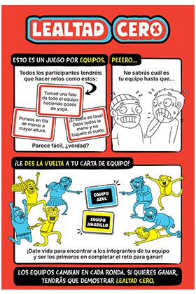 El juego de fiesta con más caos y menos lealtad al que vas a jugar nunca. Es un juego por equipos en el que todos los participantes deben superar retos que parecen fáciles al principio, pero hay un giro inesperado, ya que no sabrás cuál es tu equipo hasta que des la vuelta a tu carta de equipo. Tendrás que darte prisa para encontrar a tus compañeros y ser los primeros en completar el reto para ganar, teniendo en cuenta que los equipos cambian en cada ronda, así que si quieres la victoria deberás demostrar lealtad cero. Se adapta fácilmente a cualquier grupo de invitados y asegura partidas dinámicas y muy animadas. Contenido 20 cartas de Equipo 100 cartas de Reto 80 fichas 1 reglamento Jugadores 4 a 20 Edad recomendada 7 o más Idioma Español Tiempo de partida 20 minutos