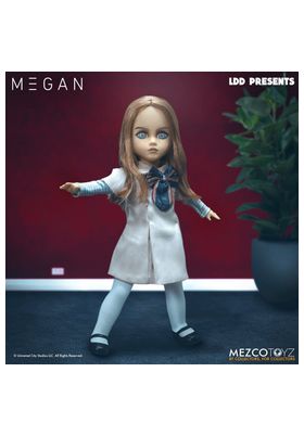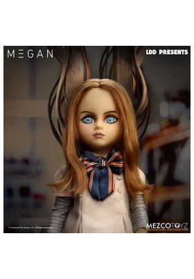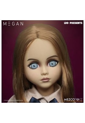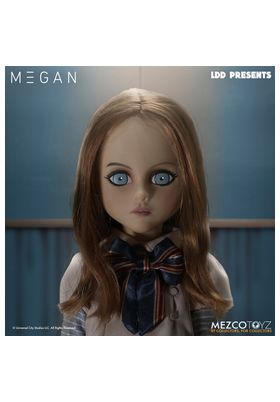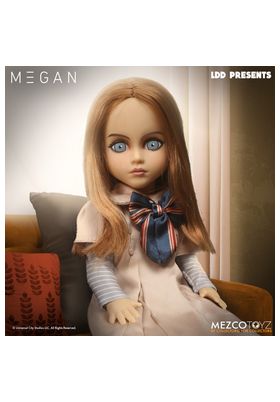 La figura de M3gan se incorpora a la colección Living Dead Dolls de Mezco Toyz con una altura de 25,5 cm. Está basada en el personaje de la película de terror "M3gan". Se muestra con su característica camisa de rayas bajo un vestido beige con pajarita, medias blancas y las clásicas Mary Janes negras. Cuenta con 5 puntos de articulación y se presenta en una caja con ventana.