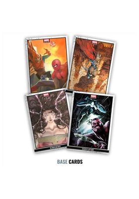 -100 cards base (también disponibles en versiones paralelas numeradas con efectos holográficos especiales) con los 100 momentos más icónicos del Universo Marvel, desde el nacimiento de Los 4 Fantásticos hasta las grandes sagas modernas, incluyendo la muerte del Capitán América, el evento Civil War y los inicios de Spider-Man y Daredevil.