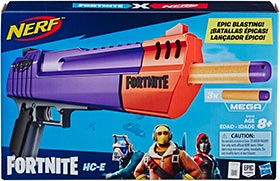 Hasbro Fans presenta el blaster MEGA HC-E de la colección NERF basado en el popular videojuego Fortnite. Carga 1 dardos en el clip interno, apunta y tira el gatillo para dispararlo. Incluye 3 dardos Nerf Mega oficiales. Los dardos oficiales de Nerf están diseñados para tener un gran alcance, tienen un rendimiento y una calidad evaluados y probados, y están hechos de espuma con puntas huecas y flexibles. Entra en la acción de Fortnite en interiores y al aire libre con este lanzador de dardos Nerf Fornite. No requiere pilas.