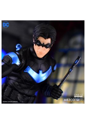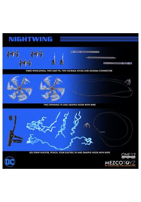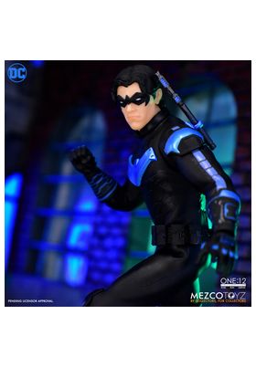 Mezco Toyz presenta, dentro de la colección One:12 Collective, la figura de Nightwing. Dick Grayson, el Robin original, mide 17 cm y está basado en su aspecto como justiciero solitario en los cómics de "DC Universe". Cuenta con más de 30 puntos de articulación e incluye 4x cabezas intercambiables, 18x manos alternativas, 3x Wing-dings, 1x conector de escrima, 2x ganchos (con cuerda y con cable), 4x efectos eléctricos, 2x efectos giratorios, 2x dardos FX, 1x base de exposición y 1x poste de exposición ajustable. Su uniforme consta de armadura pectoral, hombreras, armadura de espalda, guanteletes (I y D), cinturón utilitario, bolsa, funda para la pierna, rodilleras y botas de combate.