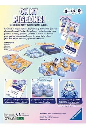Un ridiculo party game de altos vuelos! Tienta a las palomas con un tentempié, róbaselas a los otros jugadores o lanza el dado hacia sus bancos para hacer huir a sus palomas. Jugadores 2-5, edad 8+, 10-20 mins