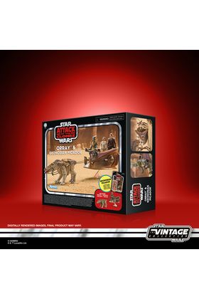 Hasbro añade a su línea Vintage Collection este set de Orray y picador geonosiano, inspirado en la Batalla de Geonosis de la película "Star Wars: Attack of the Clones" ("Star Wars: El ataque de los clones" en España). Este conjunto combina una criatura con diseño premium y una figura articulada de 9,5 cm, recreando fielmente la estética clásica de Kenner. El orray cuenta con mandíbula y patas articuladas, además de acabados fotorrealistas y el picador geonosiano incluye armadura removible y puede colocarse sobre el carrito de arena, que incorpora riendas desmontables para la montura. El set incluye: 3x accesorios y 1x base. La figura viene en blíster individual de estilo retro y se presentan en una caja ilustrada inspirada en los juguetes originales de los años 70 y 80. UNIDADES LIMITADAS.