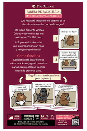 Os resultará imposible no partiros de la risa durante vuestra noche de juegos con este título que presenta viñetas únicas y desternillantes del webcomic The Oatmeal. Incluye cientos de cartas que garantizan risas y una gran rejugabilidad. La dinámica es sencilla y muy divertida, ya que competís para crear cómics sobre relaciones jugando vuestras cartas por turnos, y quien coloque la carta final más graciosa se lleva la victoria. Es un juego ideal para grupos que disfrutan del humor irreverente y las situaciones disparatadas. Contenido cientos de cartas Contiene 3 paquetes de cartas. Jugadores 2 a 8 Edad recomendada 17 o más Idioma Español Tiempo de partida 20 minutos