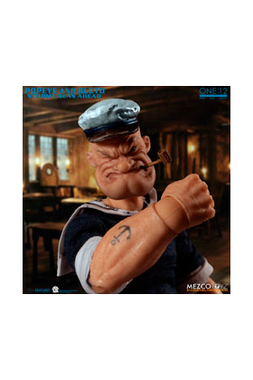 Mezco, dentro de su colección de figuras The One:12 Collective presenta la figura de Popeye, el marinero amante de las espinacas más famoso del océano, junto a su archienemigo Brutus. Estas figuras articuladas están hechas de PVC y cuentan con más de 28 puntos de articulación. La figura de Popeye mide unos 14 cm, incluye 3x cabezas intercambiables y 7x manos intercambiables. Lleva su camisa azul y sus pantalones blancos y unas botas de trabajo y además, incluye 3x sombreros, 3x pipas, 3x pipas con humo, 2x latas de espinacas (una abierta y la otra cerrada), una brújula, juego de ropa impermeable (extraibles), una bolsa de lona y una base soporte para exposición. La figura de Brutus mide unos 18 cm, incluye 2x cabezas intercambiables y 6x manos intercambiables. Lleva una camisa sobre una camiseta de manga larga, pantalones, cinturón y botas de trabajo y además, incluye una gorra de pescador,una llave inglesa, pesa rusa de metal, un gancho y una base soporte para exposición.