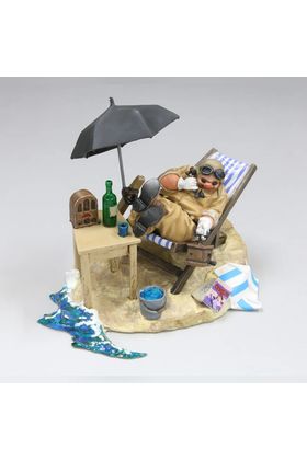 Semic presenta el kit de modelismo para montar la escena de Porco Rosso en su escondite, inspirada en la película "Porco Rosso" de Studio Ghibli. Esta detallada recreación a escala 1/48 muestra al personaje descansando en una tumbona junto a la playa, con sombrilla y diversos elementos playeros sobre una base con acabado similar a arena y olas. Está fabricado en poliestireno y las piezas se presentan en troqueles de plástico separados por color para facilitar el montaje. Se presenta en una caja e incluye manual de montaje paso a paso. Herramientas no incluidas.