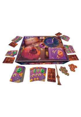 Hoy es el gran día para los aprendices de la bruja Nécrochu. Por fin se ha ido de vacaciones y ha dejado su taller al cuidado del hechicero más brillante entre vosotros. Empieza el juego. Pero es difícil encontrar los ingredientes que necesitas entre tanto desorden. Prepara tus recetas y tu varita mágica y registra todo el ático de arriba abajo. No pierdas de vista lo que hacen tus oponentes y podrás preparar tus pociones lo más rápidamente posible. Objetivo del juego: Demostrar ser el mejor aprendiz de la bruja y ganar así la partida. Para ello deberás encontrar en el ático de su taller los ingredientes necesarios para preparar tus pociones y llenar con ellas tu bolsa de hechicero. Contenido: 1 varita mágica, 4 Tapas de contenedor, 5 Cartas de bolsa (cada una con 4 espacios para fichas de poción), 40 Cartas de ingredientes, 40 Fichas de ingredientes y 40 Fichas de poción (20 con un 2 en una cara y un 3 en la otra; 20 con un 4 y un 5).
