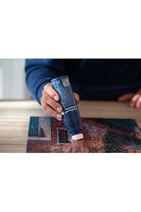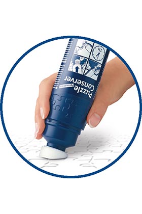 Cola especial para fijar puzzles de grandes dimensiones. La cola especial impregna directamente la esponja. Con una ligera presión del tubo se recubre el puzzle siguiendo las líneas de recorte. Tras una hora de secado este conserver tendrá un aspecto totalmente transparente.