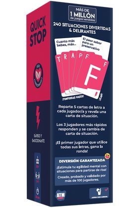 Una experiencia caótica, rápida y atrevida para fiestas en la que los jugadores deben deshacerse de sus letras respondiendo categorías descaradas y rebeldes. En cada ronda se revela una temática y todos deben responder con rapidez una palabra relacionada, ganando la ronda quien se quede sin cartas primero. El primer jugador que gana tres rondas se lleva la partida. Contenido: 240 cartas con temas y letras. Idioma: Español. Número de jugadores: 2 a 7. Edad recomendada: 16 años o más. Tiempo de partida: 15 a 45 minutos.