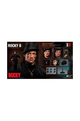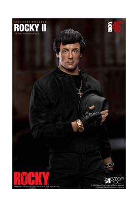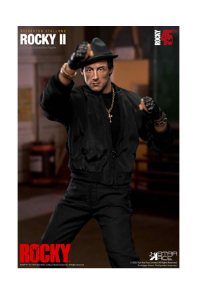 Star Ace presenta esta figura conmemorativa de Rocky con motivo del 45 aniversario del debut de esta película ganadora de un Oscar. Sylvester Stallone creó al boxeador Rocky Balboa, personaje que le lanzó al estrellato y con el que ganó varios premios de la Academia y generó una saga de películas. Stallone también escribió y protagonizó Rocky II, en la que se basa esta figura coleccionable de escala 1/6. Esta figura articulada mide unos 30 centímetros, ha sido pintada a mano con mucho cuidado para ser lo más fiel posible a los rasgos de Stallone. Incluye un sombrero negro, reloj de oro, colgante con una cruz, pulsera, ropa adicional y una base soporte para su exposición.