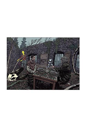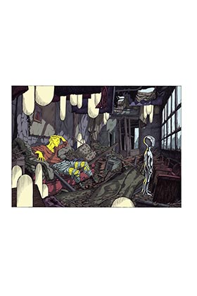 Guerras, desastres naturales, accidentes industriales, personajes y escenarios explosivos, naturaleza, cielo y océano desencadenados. El viaje que propone Frederik Peeters tiene lugar en entornos devastados, donde la prehistoria, el pasado, el presente y el futuro chocan, como si toda la cronología del mundo y de la humanidad se concentraran en un solo tiempo, un solo lugar, alrededor de este hombre preocupado, cuyo cuerpo y mente se están desmoronando. Una síntesis de la historia cuyo resultado no produce risa, sino desolación. La ganadería intensiva, la guerra, la contaminación, la comunicación virtual, el consumo excesivo... Frederik Peeters hace una amarga crítica del mundo saqueado por los hombres, en un álbum carente de palabras, pero cargado de significado.
