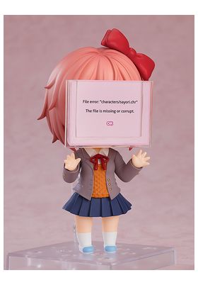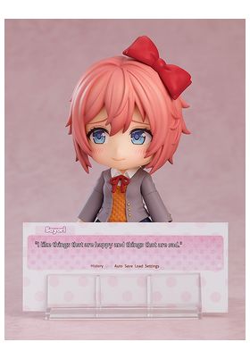 Good Smile Company presenta, dentro de la colección Nendoroid, la figura de Sayori. Está basada en el personaje del juego "Doki Doki Literature Club!" y mide 10 cm. Contiene placas faciales (cara sonriente, sonrisa triste y cara emergente) y partes opcionales (peluche de vaca y hoja de piezas opcionales).