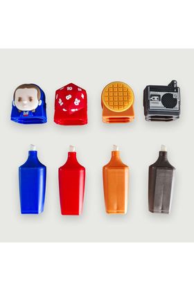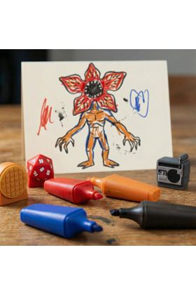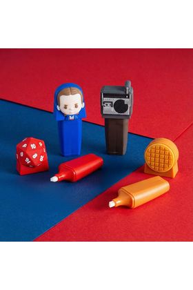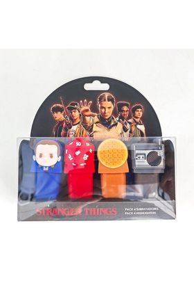 Cerdá presenta este set de 4x resaltadores decorativos inspirados en la serie de Netflix "Stranger Things". Cada highlighter presenta una figura en relieve: Once (azul), un gofre (amarillo), un dado del Hellfire Club (rojo) y un radiocasete (negro). Se presentan en una caja con ventana transparente, ilustraciones de la serie y perforación para colgar en estantería.