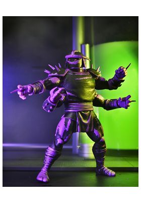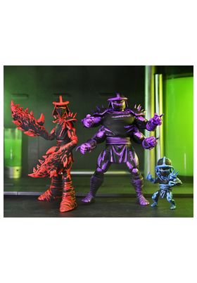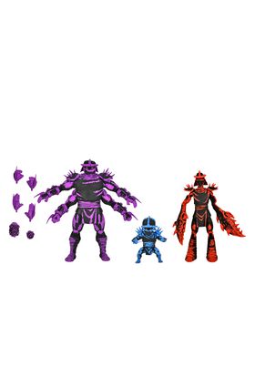 Neca presenta este set de 3 figuras de Shredder Clones. Miden 18 cm aproximadamente los más grandes y unos 7 cm el más pequeño y están basados en los cómics de "Teenage Mutant Ninja Turtles" de Mirage Comics. Incluye 2x pares de manos para el más grande y 2x gusanos espaciales. Vienen en una caja con ventana especial con temática del cómic ilustrada por Kevin Eastman.