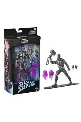Hasbro reintroduce en su línea Marvel Legends Series la figura de Silver Surfer como "Fallen One , un versión de Estela Plateada de color obsidiana quien, empuñando el martillo Mjölnir, pretende vengarse de Thanos por haber matado a Galactus. La figura mide 15 cm y presenta un diseño premium con múltiples puntos de articulación para poses dinámicas. Incluye: 2x manos alternativas, 1x tabla de surf, 2x efectos de energía y 1x Mjölnir (martillo de Thor). Se presenta en una caja con ventana ilustrada. UNIDADES LIMITADAS.