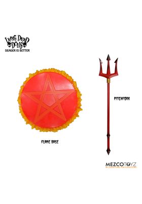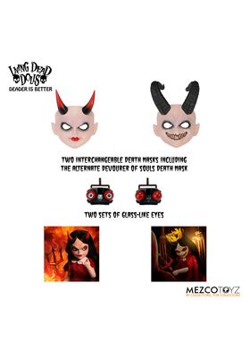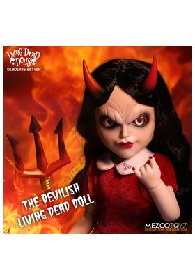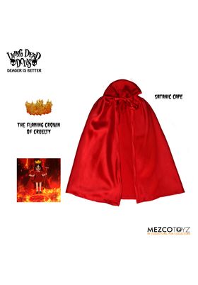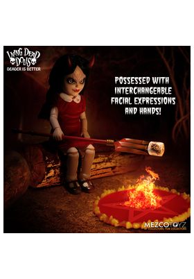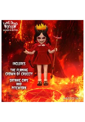 Mezco Toyz presenta, dentro de la colección Living Dead Dolls, la figura de Sin. Mide 25,5 cm y se muestra con un vestido rojo de pana con el "666" bordado en el cuello, calcetines con volantes y zapatos Mary Jane con tiras. Cuenta con 18 puntos de articulación, 6x manos intercambiables, 2x máscaras de la muerte, 2x pares de ojos de cristal, 1x capa satánica, 1x corona flamígera de la crueldad, 1x horca y 1x base en llamas. Se presenta en una caja con forma de ataúd.