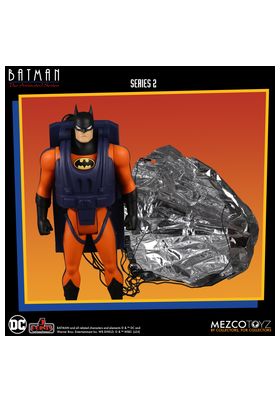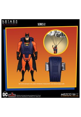 Mezco Toyz presenta, dentro de la colección 5 Points, la figura de Sky Dive Batman. Mide 9,5 cm y está basada en el personaje de la serie de animación de los 90 "Batman: The Animated Series". Incluye 1x paracaídas desmontable y 1x capa extraíble. Puedes exponerla junto a las figuras de Harley Quinn, Two-Face, Mr. Freeze y Batman con su Batcycle (se venden por separado). Se presenta en un blíster.