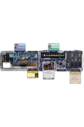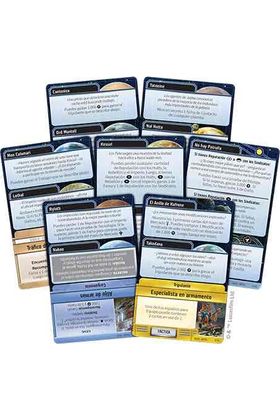 12 Hojas de nave, 4 Tableros de Jugadores, 4 Marcadores de Fama de Plástico, 16 Fichas de Reputación, 22 Fichas de Contacto, 16 Fichas de Patrulla, 8 Personajes de cartón con sus peanas, 40 Fichas de Daños, 60 Fichas de Crédito, 70 Cartas de Encuentro, 70 Cartas de Mercado, 53 Cartas del Banco de Datos, 8 Cartas de Personaje, 4 Cartas de Referencia, 10 Cartas de IA, 12 Fichas de Objetivos, 6 Fichas de Mapa, 2 Finales de Mapa, 6 Dados, 1 Aprenda a Jugar, 1 Referencia de Reglas.