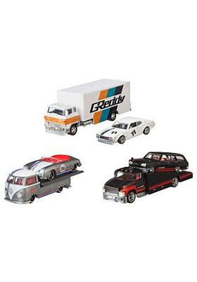 Mattel presenta, con motivo del 50 aniversario de Hot Wheels, el surtido de 4 unidaes de vehículas de la línea Team Transport a escala 1/64, que incluye algunos de los modelos más icónicos de estos pequeños vehículos resenta acabados realistas, adornos geniales y un montón de ruedas que los coleccionistas apreciarán. Cada vehículo ha sido durante años uno de los más populares entre coleccionistas y fans de las carreras de todas las edades. Vehículos con detalles realistas y adornos auténticos creados minuciosamente para representar una gran variedad de increíbles modelos. Cada surtido incluye vehículos de una temática, como coches potentes, deportivos, coches de carreras, camiones y descapotables a la última moda.