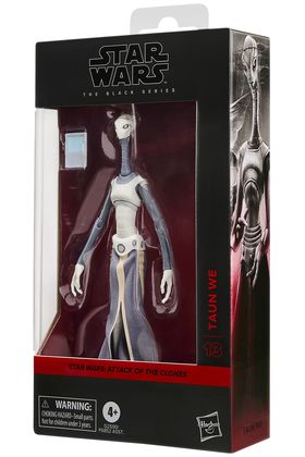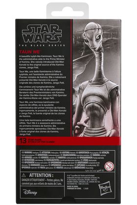 Hasbro suma a su catálogo The Black Series la figura coleccionable de Taun We, basada en la película "Star Wars: Attack of the Clones" ("Star Wars: El ataque de los clones" en España). Esta kaminoana, ayudante administrativa del primer ministro de Kamino, destaca por su estilizada complexión y su cuidada recreación con detalles fieles al largometraje. La figura cuenta con múltiples puntos de articulación y una altura aproximada de 17,5 cm. Incluye 1x tableta de datos para reproducir su icónica escena junto a Obi-Wan Kenobi (se vende por separado). Se presenta en una caja con ventana con ilustraciones. UNIDADES LIMITADAS.