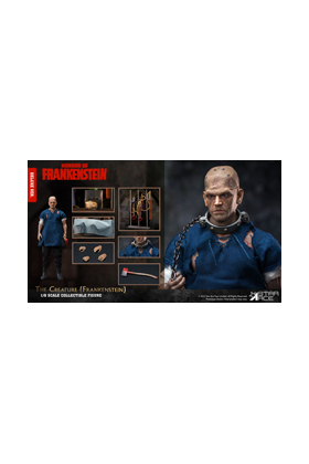 Star Ace presenta su versión del monstruo de Frankenstein, conocido por las películas de Hammer Films de los años 70. Esta figura articulada de 32 centímetros en escala 1/6 y presenta los rasgos de Dave Prowse como La Criatura y su vestimenta es la original de la película "Horror of Frankenstein" de 1970. Se ha pintado a mano, lo que hace que la expresión facial sea muy detallada. Incluye manos intercambiables, un hacha, ropa, un trapo, un collar, una cabeza en una jarra, un juego de tubos de ensayo y una base soporte para su exhibición.