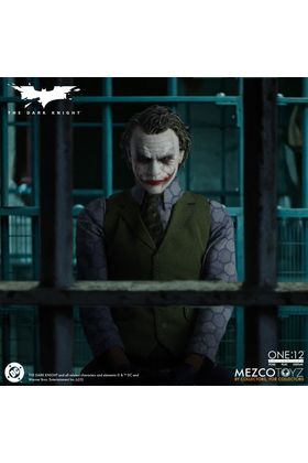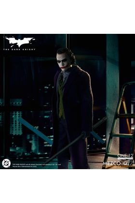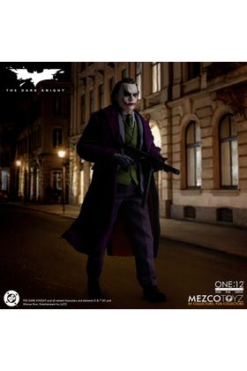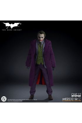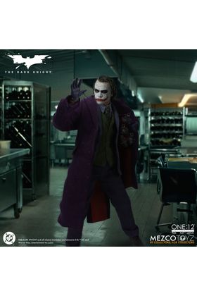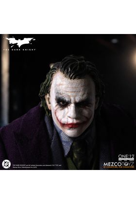 Mezco Toyz añade a su línea One:12 Collective la figura de The Joker, basada en el personaje interpretado por Heath Ledger en la película "The Dark Knight" ("El caballero oscuro" en España) de 2008. Mide aproximadamente 17 cm de alto y cuenta con más de 30 puntos de articulación para un mayor rango de movimiento. Reproduce con gran detalle su característico atuendo compuesto por abrigo púrpura, chaqueta, chaleco, camisa, corbata, zapatos de vestir y pantalones de rayas. También incluye 4x cabezas con diferentes expresiones faciales, 1x subfusil con 2x cargadores extraíbles y 1x efecto de ráfaga, 1x pistola con 2x cargadores y 2x efectos de disparo, 4x granadas, 4x cuchillos, 1x detonador, 1x carta, 1x taco de billar roto (en dos partes), 1x panel de exhibición con la frase "Why so serious?" y 16x manos para múltiples poses (puños, realizando gestos icónicos, y para sujetar los diferentes accesorios). También se incluye una base de exposición circular con el logotipo del film y un soporte ajustable transparente. Se presenta en una caja diseñada especialmente para exposición.