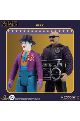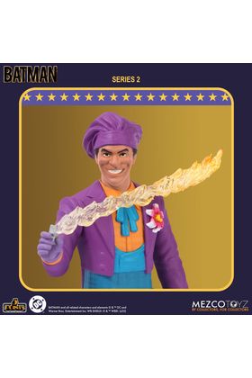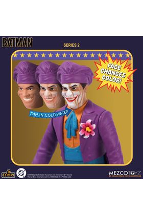 Mezco Toyz incorpora a su colección 5 Points la versión Caos en el Museo de la figura articulada del Joker basada en su apariencia en la película "Batman" de 1989. Mide aproximadamente 9,5 cm y se presenta en formato blíster con estética retro. Incluye 1x cabeza adicional especial que revela su aspecto real al mojarla con agua fría, 1x encendedor con efecto de llamarada, 1x brazo intercambiable para sostener el encendedor y 1x bastón. Ideal para exhibir con el resto de figuras de la serie 2 (se venden por separado).