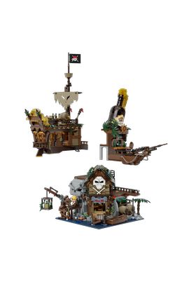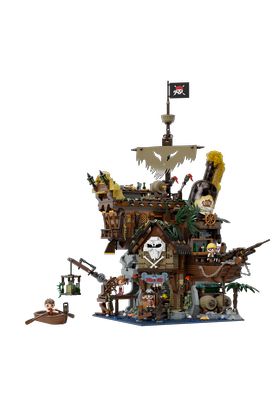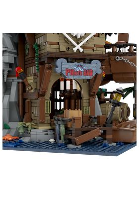 Pantasy presenta, dentro de la colección Retro Series, este set de construcción de The Pirates Pub. Tiene unas medidas de 58 x 44 x 44 cm y está inspirado en un antiguo bar pirata. El set está formado por 2858 piezas y requiere de 5 horas aproximadamente para su montaje. Este gran pub de piratas, encaramado en un acantilado junto al mar, presenta un misterioso estilo de naufragio de varias capas. Cada capa, desde la estructura hasta la decoración, está llena de atrevidos detalles piratas. La 1ª planta es el bar, el corazón del edificio. Cuenta con farolas y antorchas en la entrada del muelle, unas mesas preparadas con comida y bebida, una acogedora chimenea y unas velas. La pared del fondo puede abrirse para revelar más detalles ocultos. La 2ª planta incluye una cocina interior con fogones, utensilios e ingredientes, además de una lámpara de aceite y una pequeña mesa redonda junto a la ventana. El bar exterior presenta un diseño de dos niveles, decoración náutica y taburetes altos, con una terraza que ofrece una vista despejada del mar. La 3ª planta es el salón del dueño del pub. Al abrir la pared del fondo se descubre un acogedor espacio con una cama, una silla, un escritorio, una lámpara de araña y ventanas arqueadas. Arriba, una terraza en la azotea con una mesa de comedor, un gran barril, un mástil pirata, una bandera y una botella gigante. La edad mínima recomendada es de 6 años. Incluye un manual de instrucciones y 4 minifiguras de Pantasy diseñadas a medida y con atuendos piratas para colocar en cualquier parte del pub.